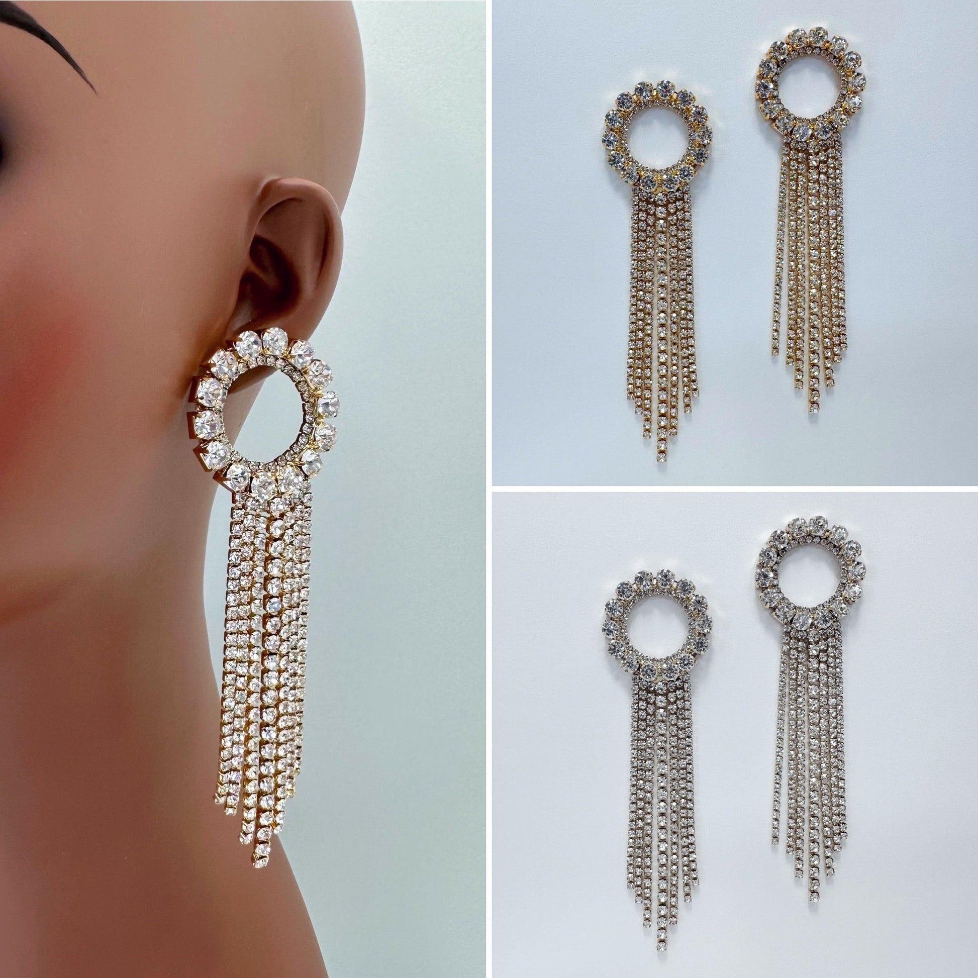 Rhinestones Deco circle with Tassel Design Drop Dangle Post Earrings