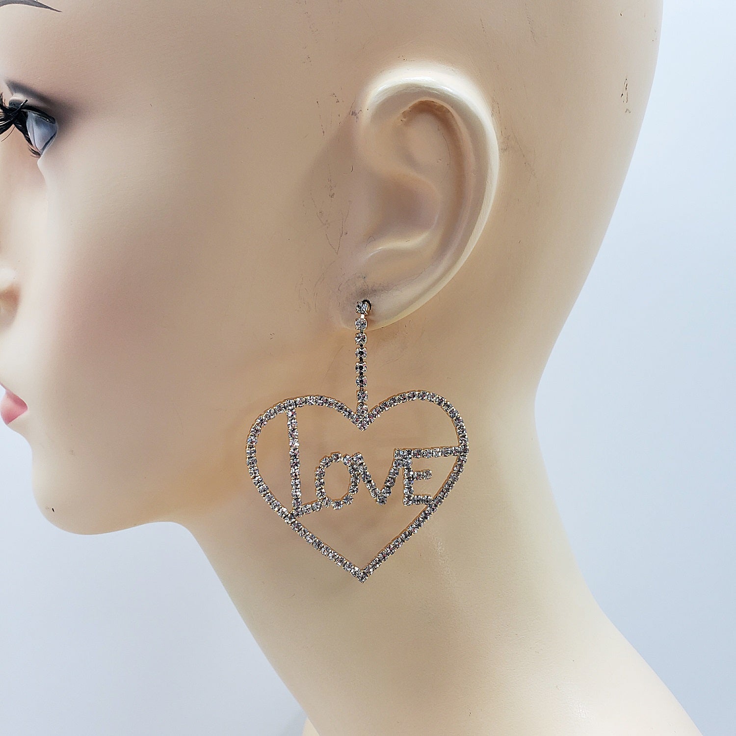 Rhinestones Deco Word Letter LOVE heart Shape Drop Dangle Post Earrings