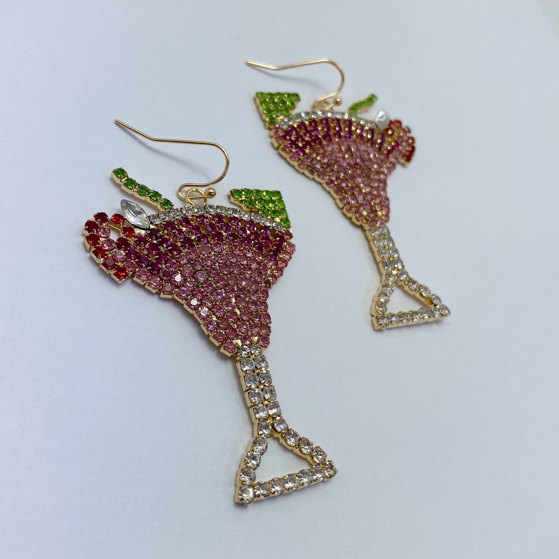 Rhinestones Deco Cocktail Glasses Design Drop Dangle Hook Earrings