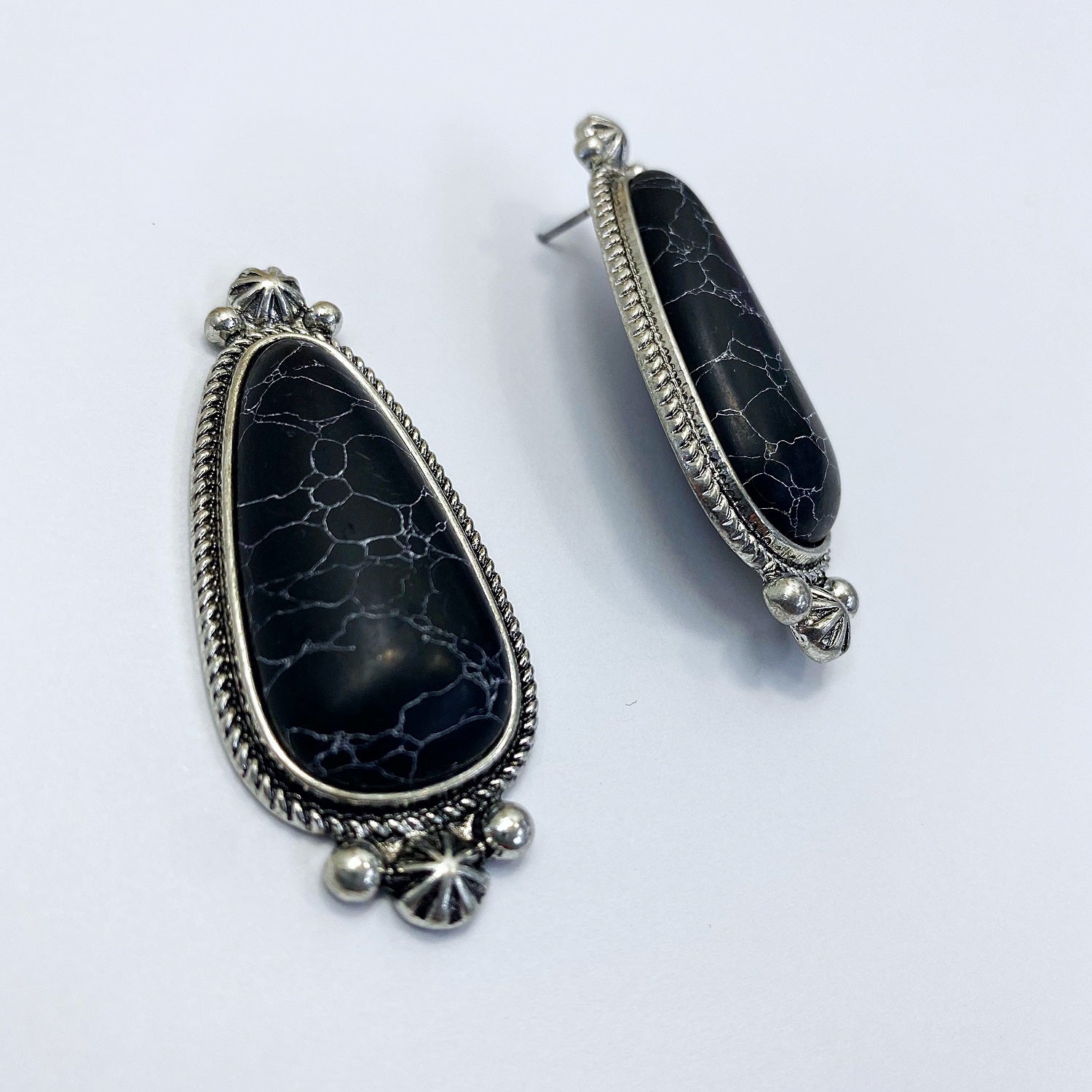 - These handcrafted earrings feature elongated stone inlays framed in detailed metalwork with twisted edges and stamped accents, creating a refined yet rustic silhouette. Securely set in sturdy metal bezels, each piece is finished with sculpted bead elements for added dimension and craftsmanship. Their bold shape and intricate detailing make them strong sellers year-round, especially during gifting seasons and fall–winter collections where textured accessories elevate layered outfits. Merchandize these earrings with neutral apparel, artisan-inspired pieces, or alongside coordinating rings and cuffs to create a cohesive, high-impact display.