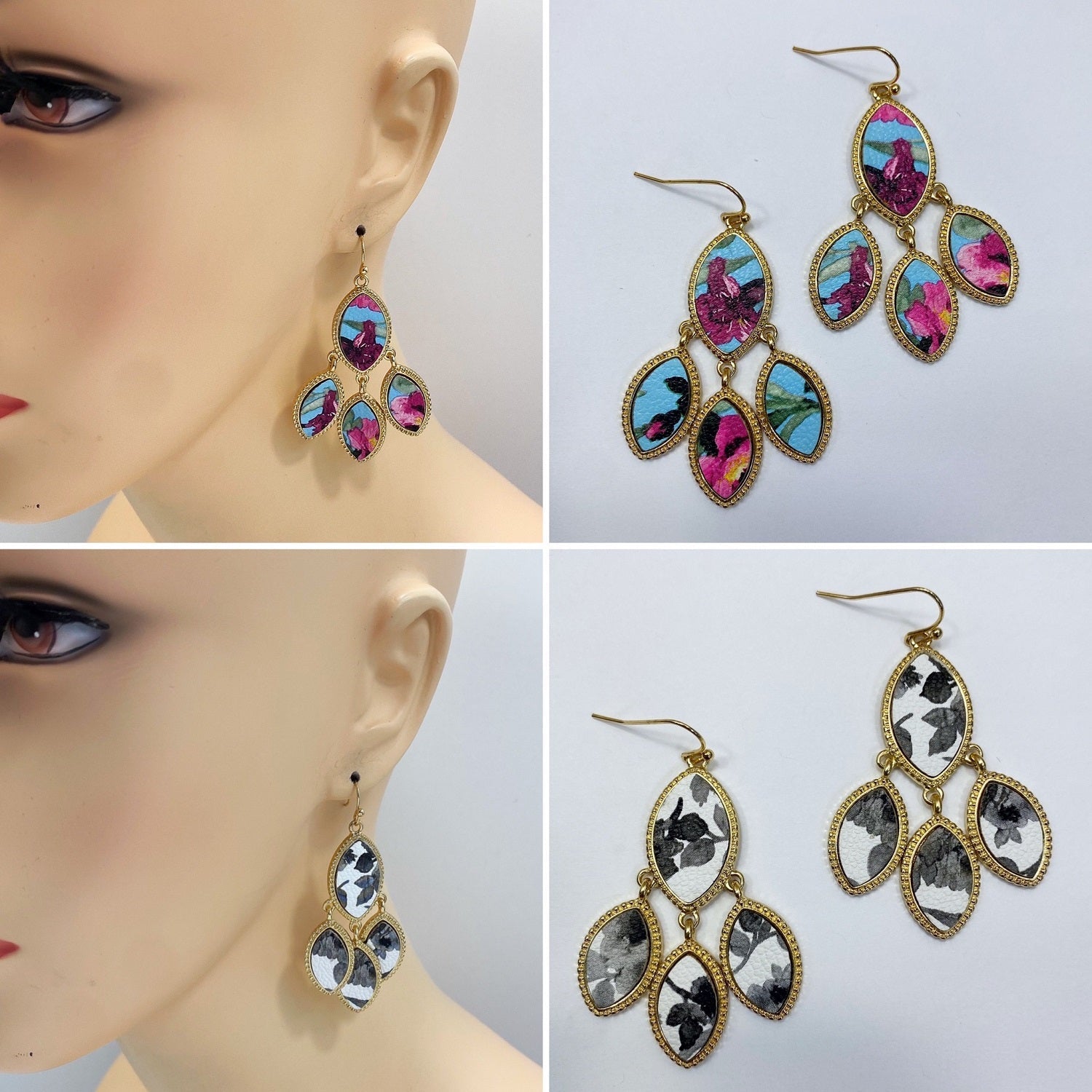 - These lightweight chandelier earrings feature layered leaf-shaped drops framed in textured metal and filled with soft floral prints for a bold yet feminine finish. Each tier is linked with smooth connectors, creating fluid movement and eye-catching dimension without added weight. Their blend of statement shape and delicate floral detail makes them strong sellers for spring and summer collections, special events, and everyday boutique styling. Perfect for merchandising with boho apparel, dresses, or romantic accessory displays where their cascading silhouette and floral charm naturally stand out.