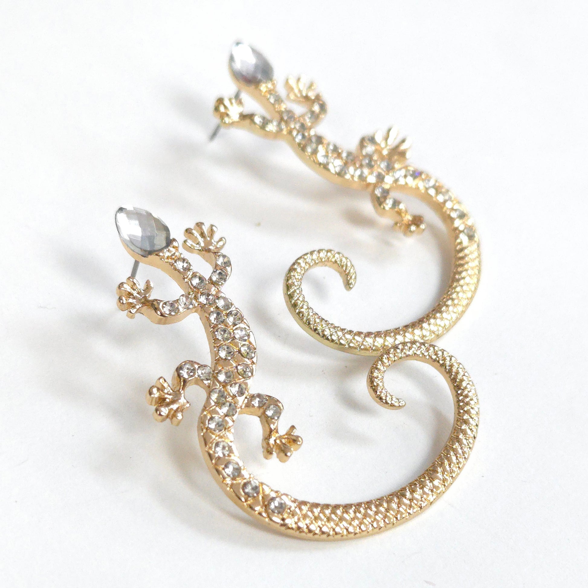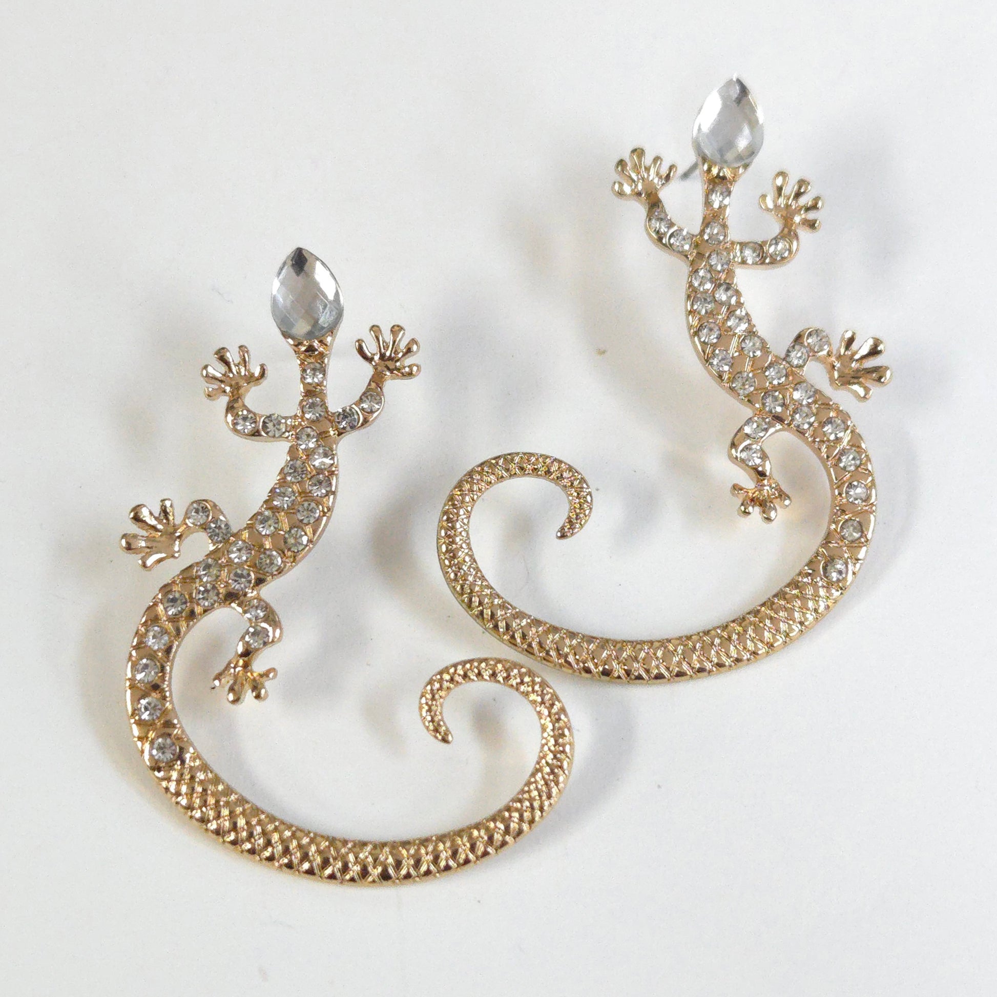 Rhinestones Deco Lizard Gecko Design Drop Dangle Hook Earrings
