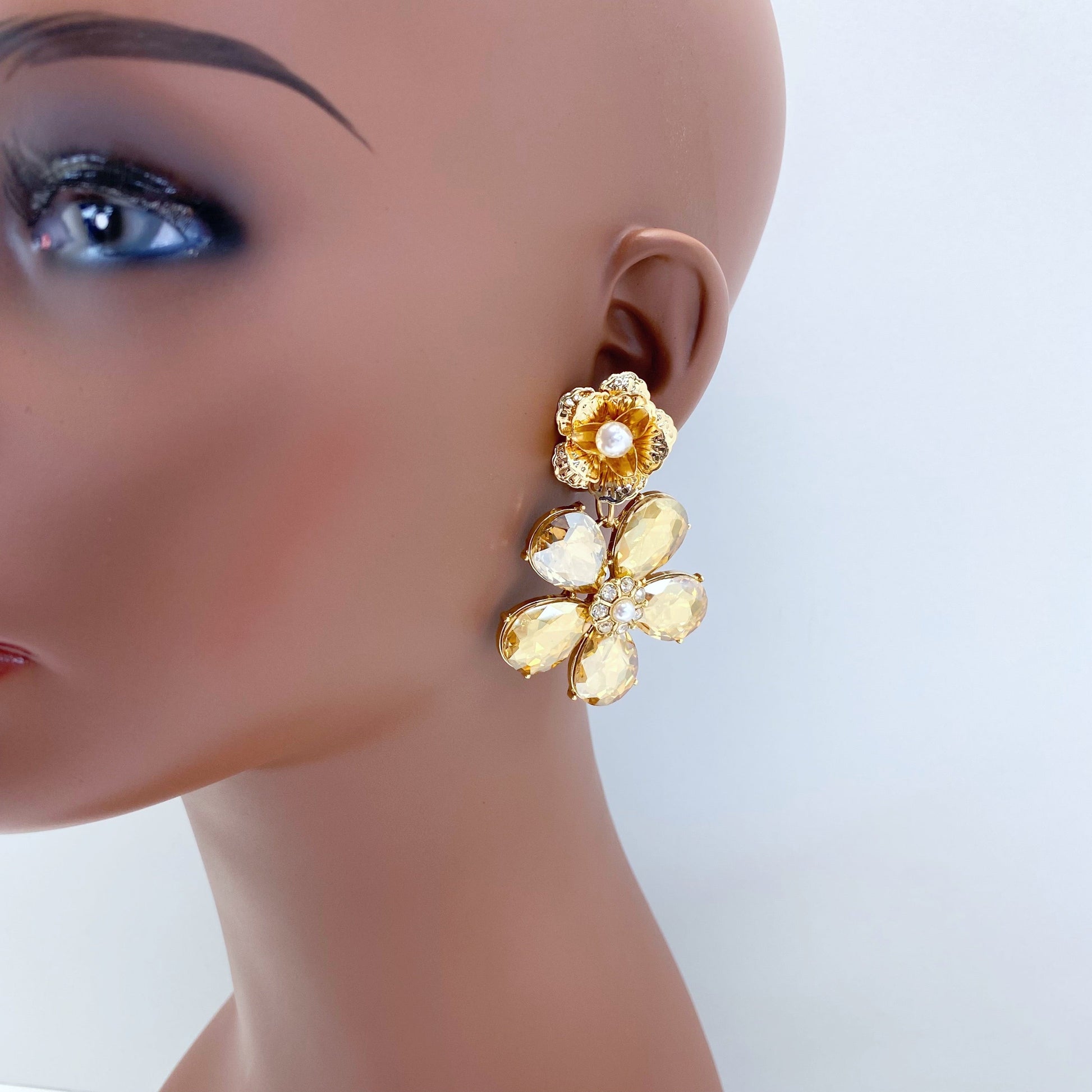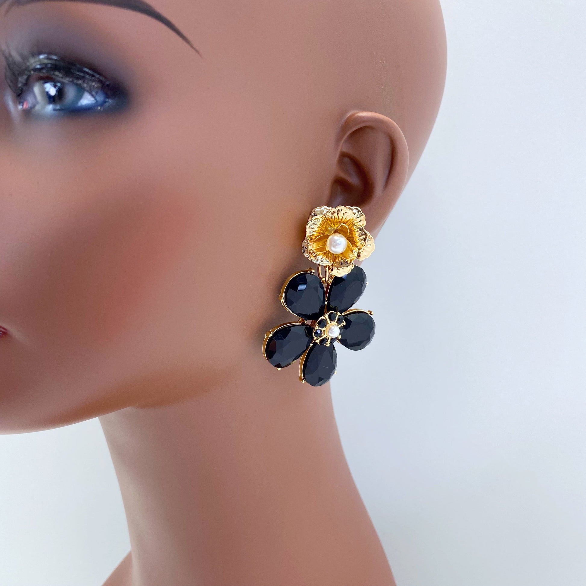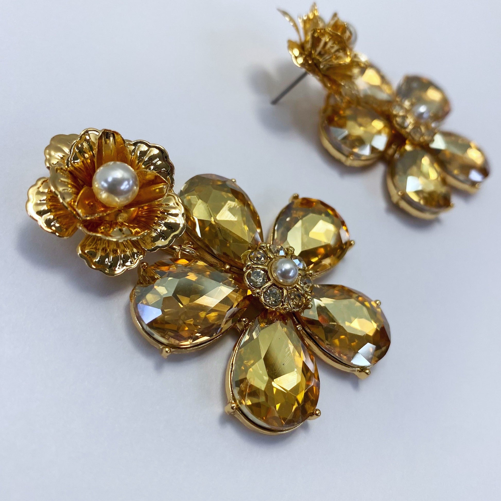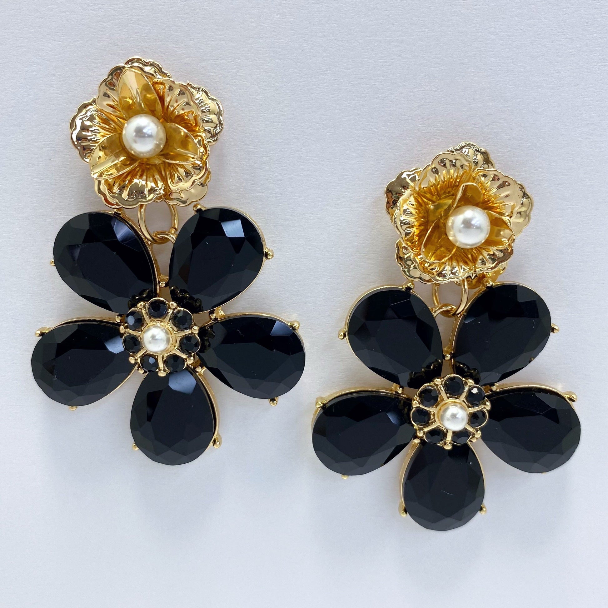 Rhinestones Deco Flower Design Drop Dangle Post Earrings