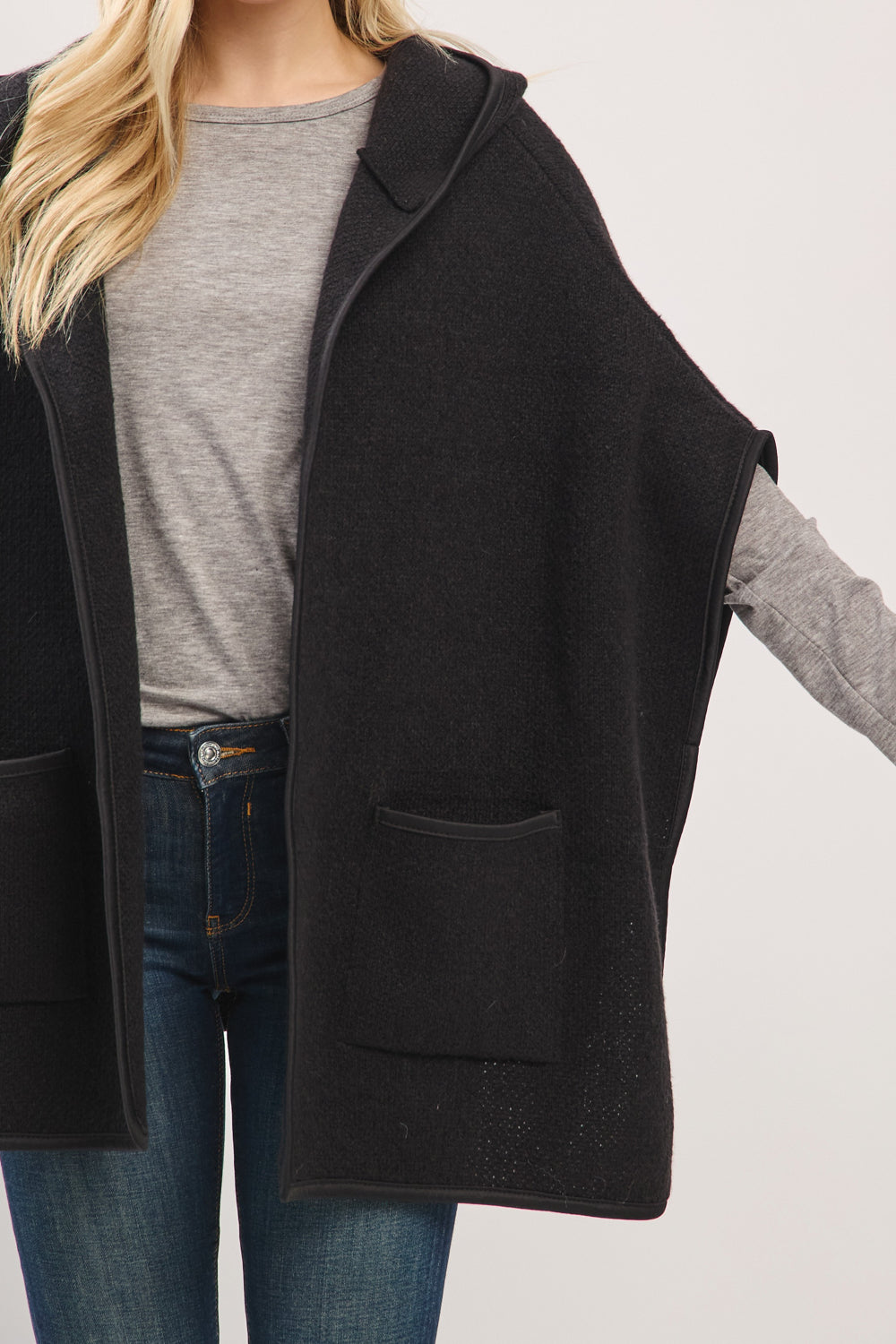 HOODED PONCHO WITH TRIM AND FRONT POCKETS