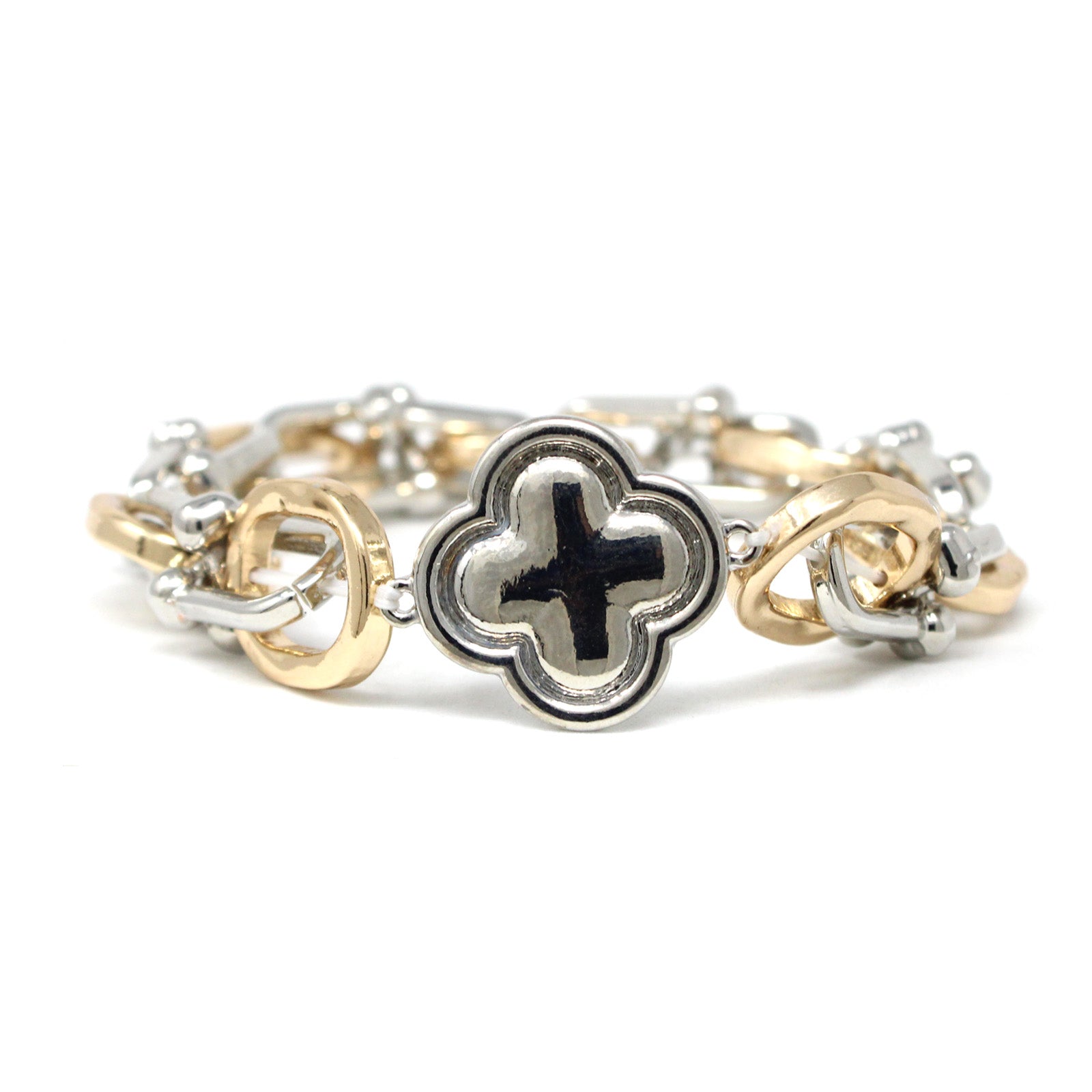 A stylish bracelet featuring a bold clover centerpiece paired with interlocking links for a modern, polished look. Designed with a mix of sleek textures and refined details, this piece adds elegance and versatility to any outfit.