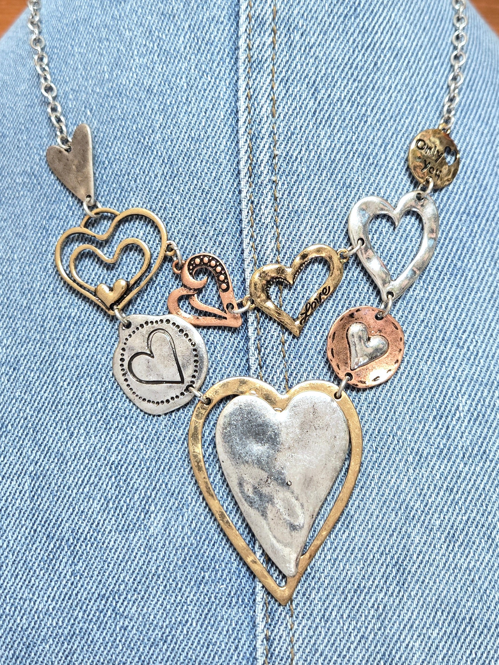 N0429 QNE15572 Antique Tone Metal Heart Love Designs Linked Necklace