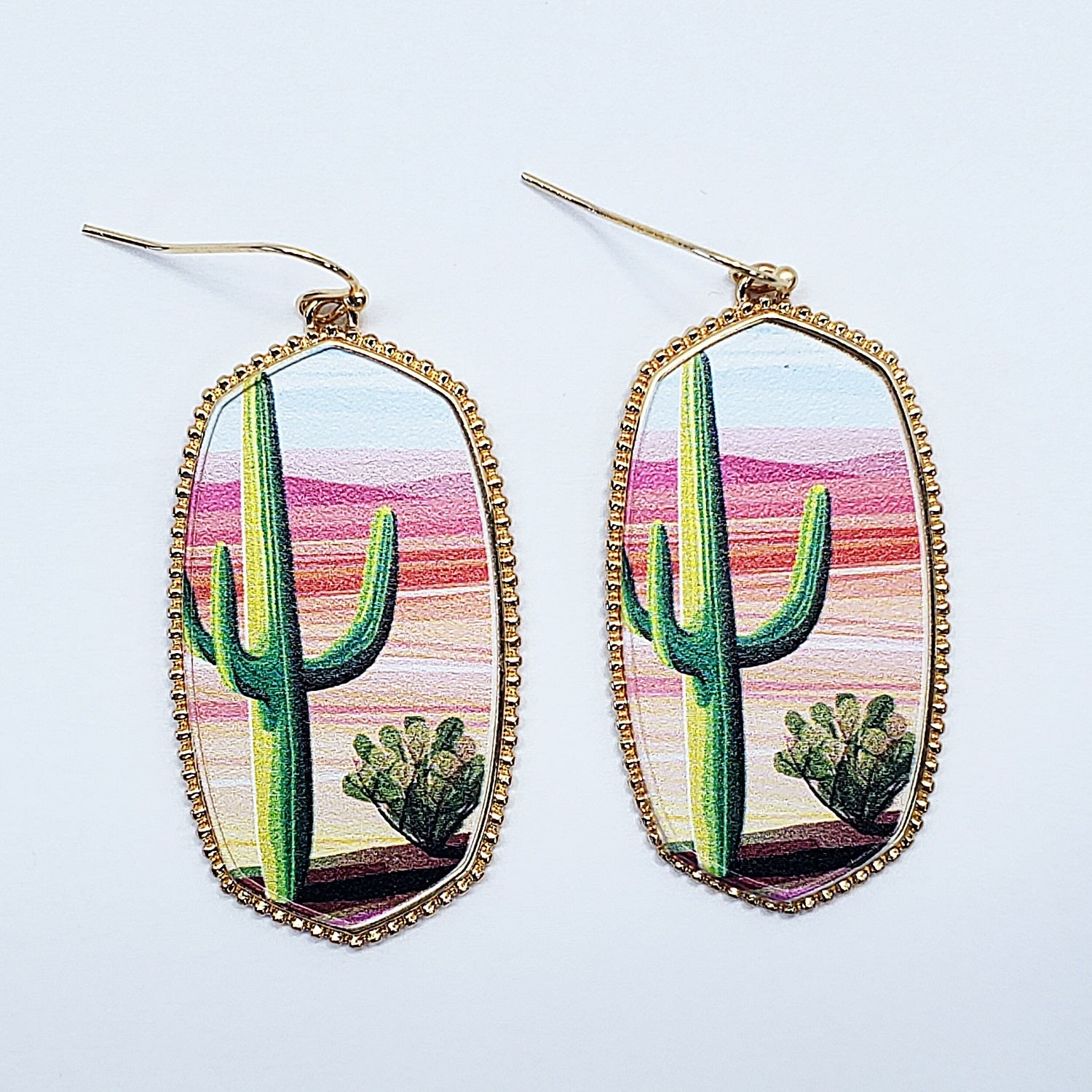 E1039 VER4417 Western Desert Cactus Design Oval Shape Drop Dangle Earrings